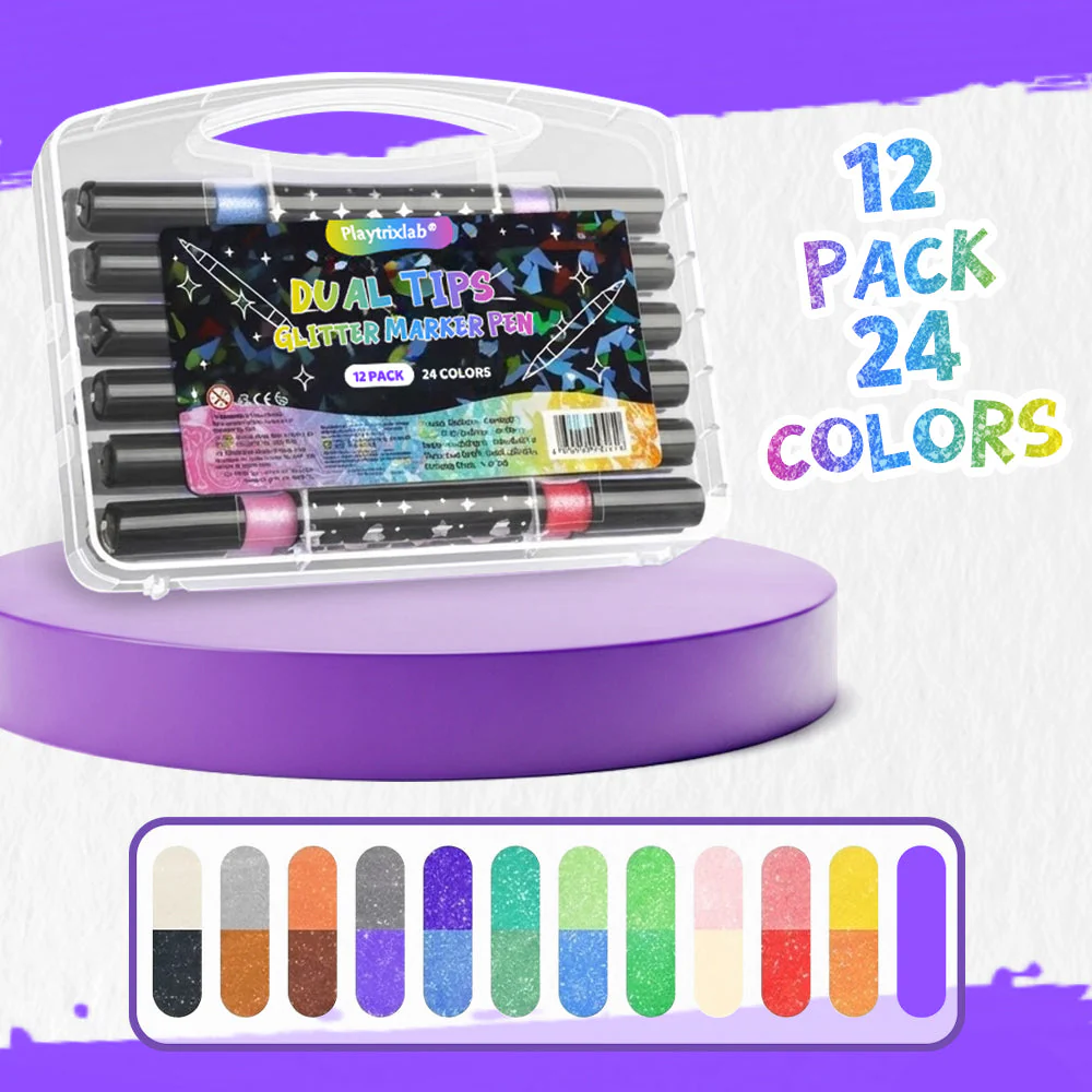 Name: Playtrixlab® Dual Tips Glitter Marker Pen Length: 14 cm Material: Eco-Friendly PP Material Ink: Shimmer Pearl Ink Tip: Fiber Nib