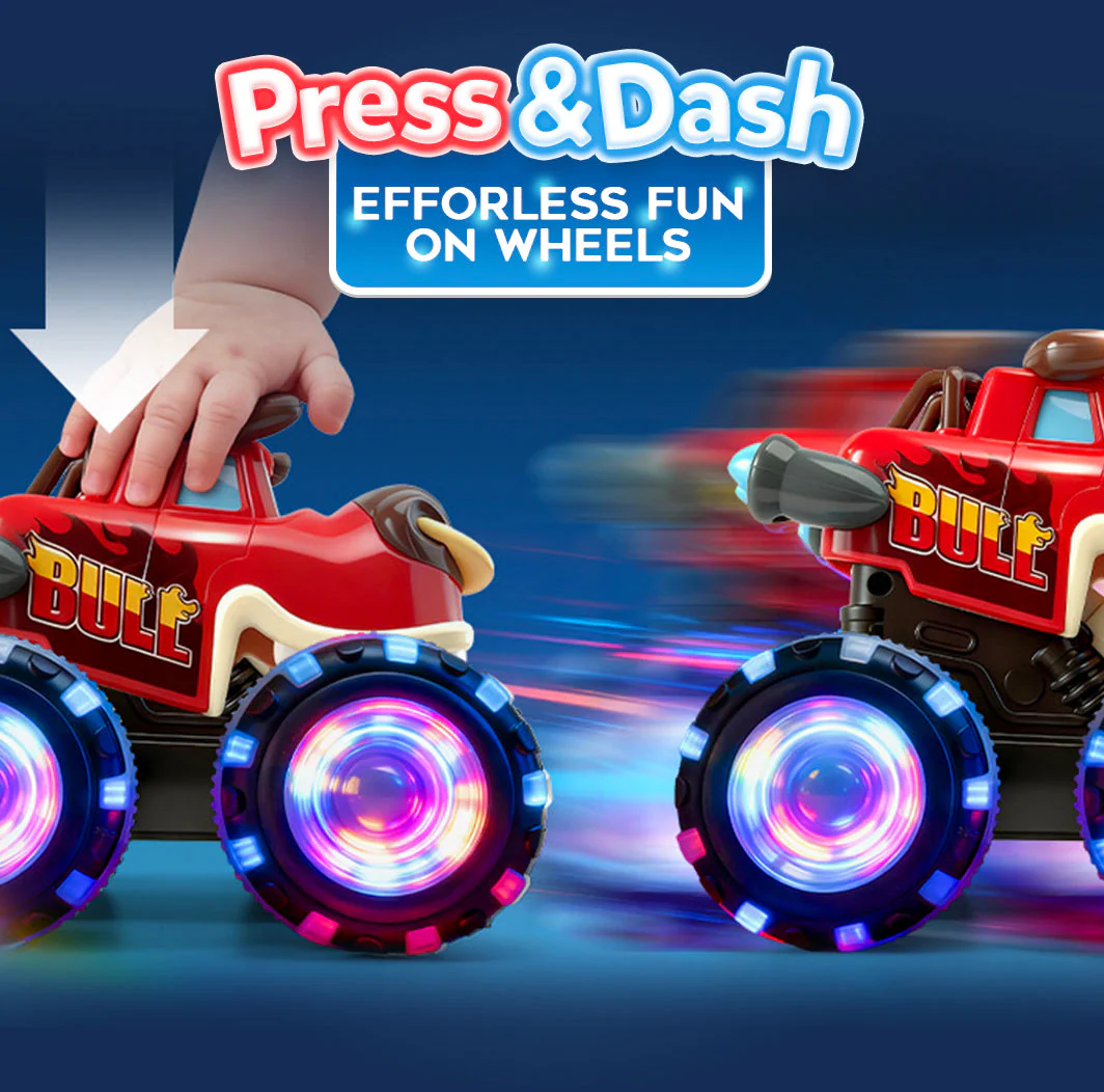 Unleash colorful fun with three wild characters—Shark, Bull, and T-Rex. Each truck is built with a bold animal-inspired design and vibrant light-up wheels that glow brighter with every roll. Perfect for toddlers who love action, color, and imaginative creature play.